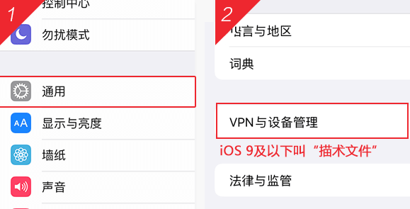 2.然后在设备中点击【设置>>通用>>VPN与设备管理】(iOS9上叫“描述文件”, iOS10上叫“设备管理),找到刚才同名的描述文件: